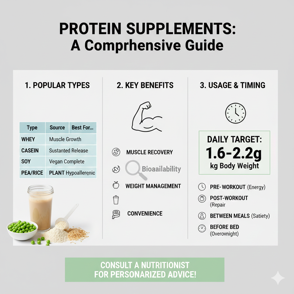 Protein supplements such as whey protein, casein protein, and plant-based protein powders provide a concentrated and convenient source of high-quality protein. They are widely used by athletes, fitness enthusiasts, older adults, and individuals following structured diet plans. When consumed responsibly, protein supplements can help preserve lean muscle mass, support weight management, and improve physical performance.